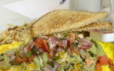 Home fries, chorizo, jalapenos, yellow onions, cheddar/jack, topped with two basted eggs, fresh pico de gallow and a drizzle of avocado creme