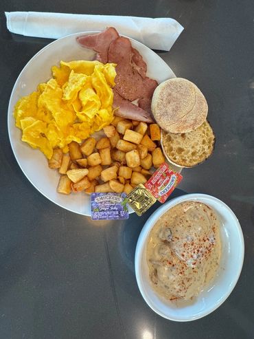 Home fries, pork sausage, green pepper, yellow onion and cheddar/jack, smothered in our house-made pork sausage gravy and topped with two basted eggs